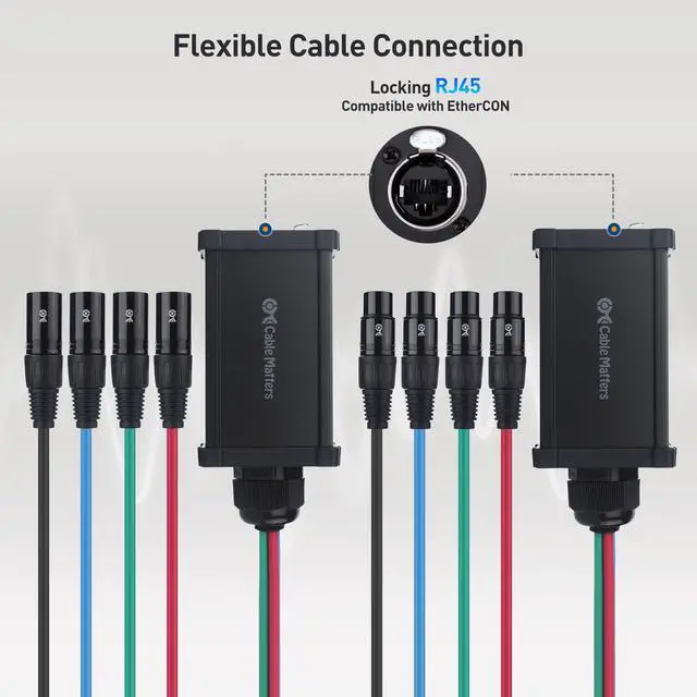 Sound: Connect multiple XLR devices for a single cable run with this box compatible with EtherCON connections; Each XLR over Cat5/Cat6 box converts an Ethernet connection to 4x XLR connectors for the ultimate audio connection solution ^^ Durable