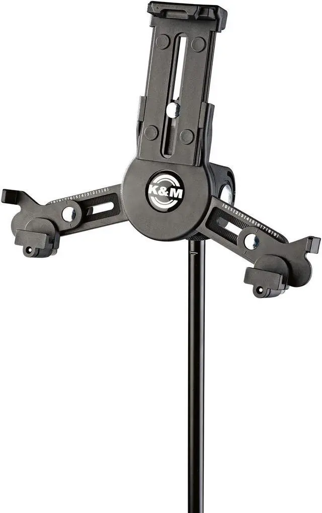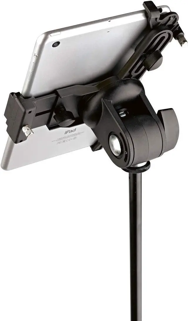 König & Meyer K&M 19795.500. 55 Universal Mini Tablet iPad Holder for a microphone stand allows for maximum stability so you can focus on your music. Secure corner and center clamps to hold in place for easy viewing and switching from landscape to portrait. Easy to assemble, adjust and is preferred among musicians.