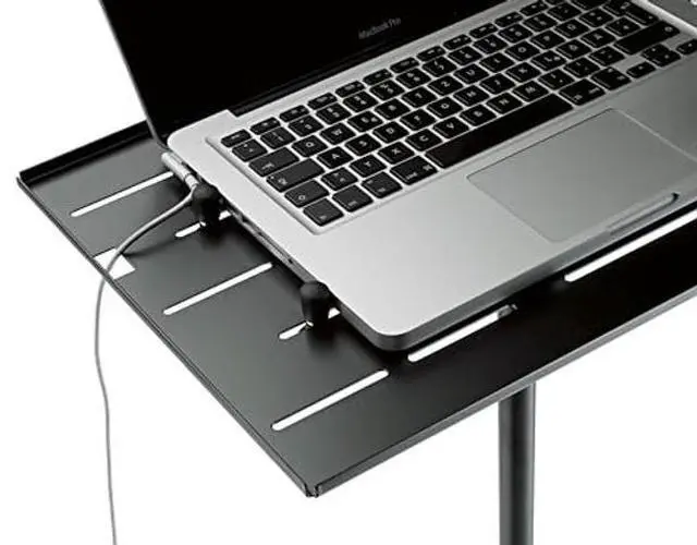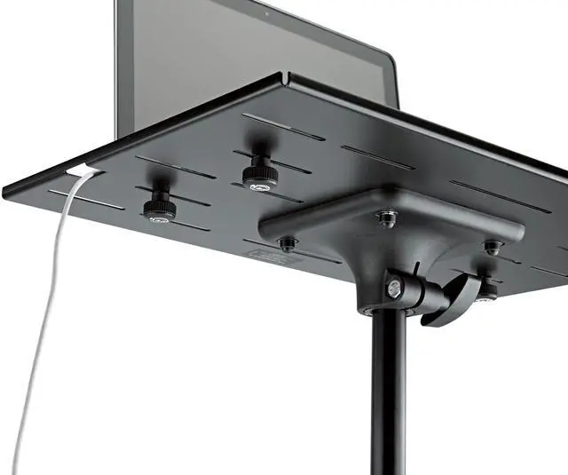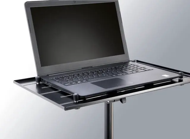 Product DescriptionThis laptop stand offers stability and safety. The generously sized tray provides space for all common laptops. Thanks to the adjustable clamping bolts with rubber caps, the laptop is protected and can be secured safely on the stand. To secure the laptop, the clamping bolts are pressed on the laptop using wing nuts. The height of the stand can be adjusted variably. For transport the tray can be removed easily without the use of tools. The robust tripod legs quickly collapse together into a compact and easy to carry package.