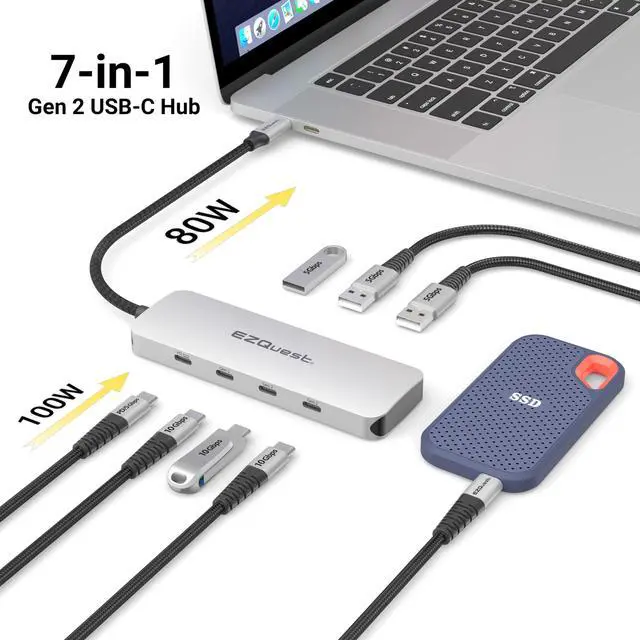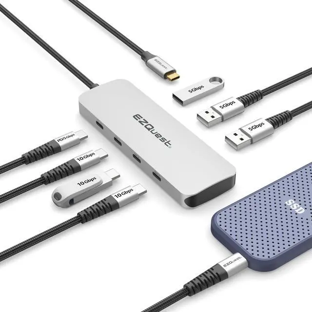 [ULTIMATE CONNECTIVITY HUB] Unleash the full potential of your devices. Our USB C Hub contains 3X Gen 2 USB-C 10Gbs & 3X USB 3.0 ports 5Gbs. When using all ports simultaneously, the total shared data is 10Gbs. The professional EZQuest USBC Hub can be used for MacBooks, Mac Mini, Laptops, and beyond simplifying your workflow today.