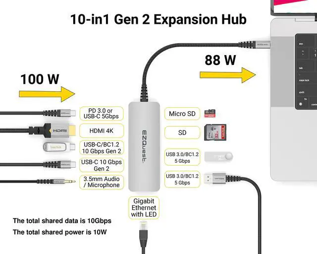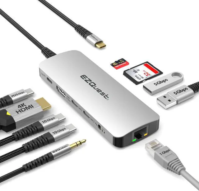EZQuest USB C Hub Docking Station 10 in 1 with 4K HDMI 60Hz, 1 Gbs Ethernet, 2 USB C Gen 2 10Gbs Ports, 1 USB C PD 3.0 Port, 2 USB A 3.0 Ports, Audio Port, SD/Micro SD, Compatible with USB-C Computers