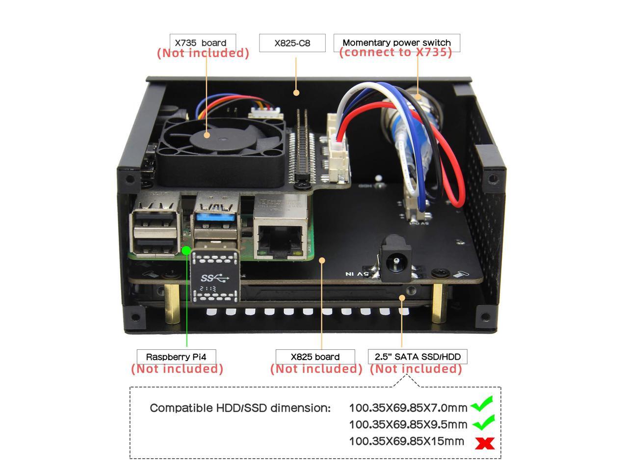 - Compatibility: X825-C8 is only compatible with X825 V2.0 and Raspberry Pi 4 and X735 power management board