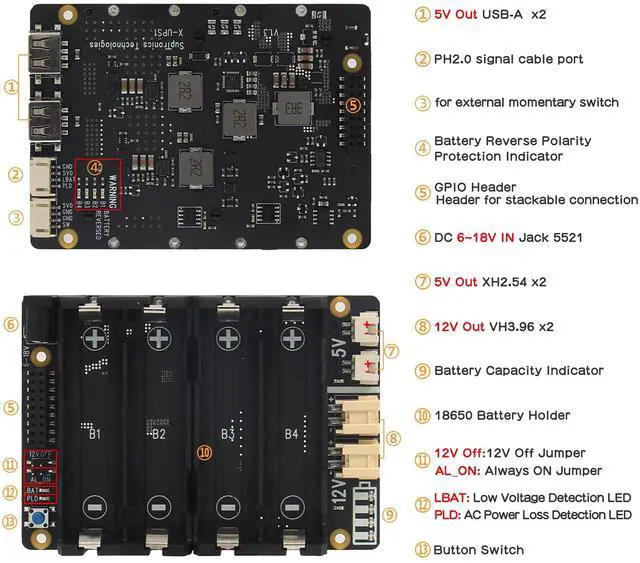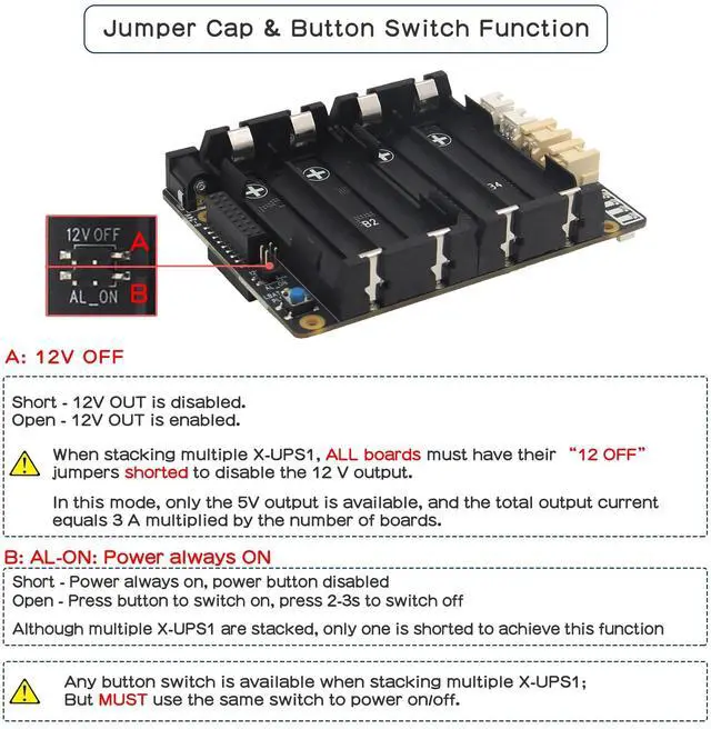 Stackable Design: X-UPS1 can be stacked to increase output current and battery life, each board provides max 3A power backup; Stack several X-UPS1 to provide long-lasting and higher output power for 24/7 ^^