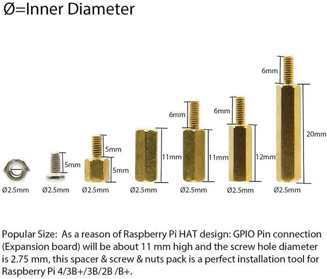 Raspberry Pi HAT design: GPIO Pin connection (Expansion board) is about 11 mm high and the screw hole diameter is 2.75 mm, this spacer, screw and nuts pack is a perfect installation tool for Raspbery Pi 5 / 4B / 3B+ / 3B / 2B /B+/3A+/A+ ^^ Durable Material and