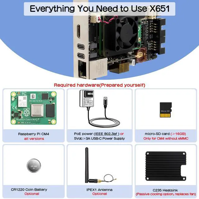 Cool: X651 comes with an active cooling fan (X-FAN30 V 1.0 ) to cool down the Raspberry Pi Compute Module 4, you can also replace it with C235 heatsink ^^ Extra Need to be
