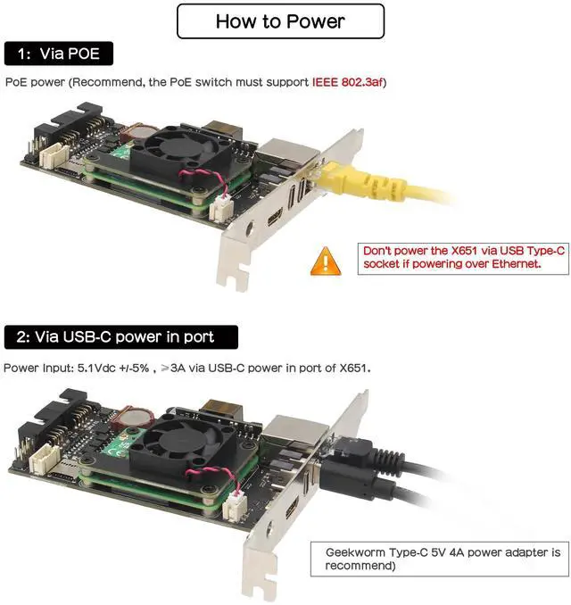 Power Input: 5.1V dc +/-5%, 3A power via USB-C port of X651 ^^ How to