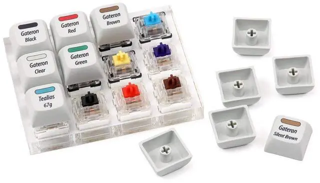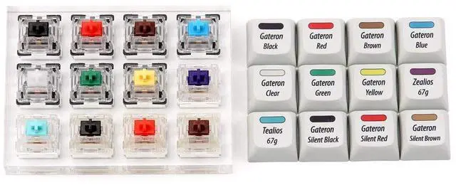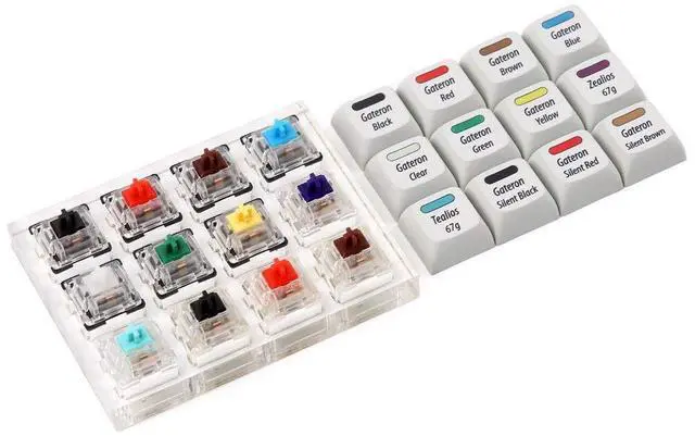 The switches are mounted on a clear acrylic plate with a 1x12 layout, allowing users to easily press each switch and compare their individual tactile and audible properties. The plate is also designed to fit easily into a standard keycap set, making it easy to swap out and test different keycaps on each switch. Overall, the Gateron + Zealios + Tealios Key Switch 12-Key Tester Kit is an excellent tool for anyone looking to build a custom mechanical keyboard or simply to explore the different options available in the market. It provides a tactile and audible reference point for each switch type, allowing users to make informed decisions when selecting switches for their keyboards.