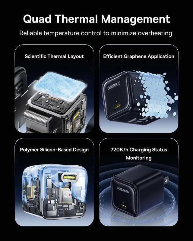 Quad Thermal Management: The usb c fast charger equipped with advanced graphene cooling, scientific stacking thermal layout, polymer silicon-based design, and 720K/h charging status monitoring, this fast charger USB-C ensures optimal heat dissipation for faster charging and enhanced device protection.
