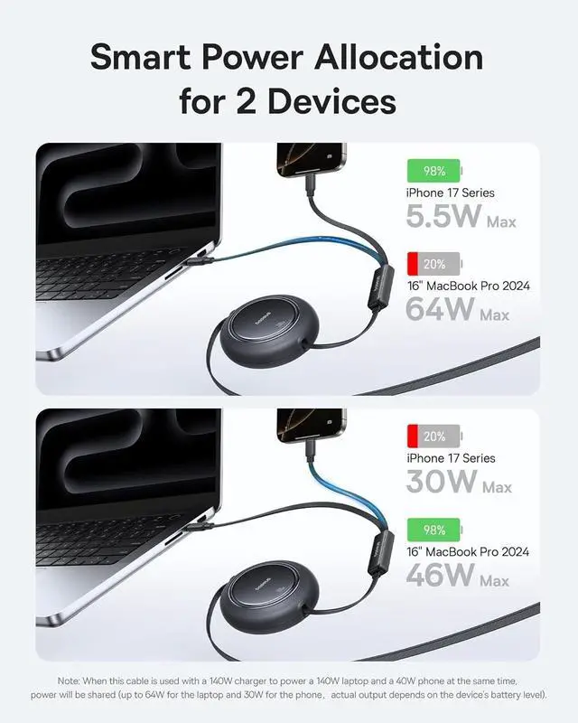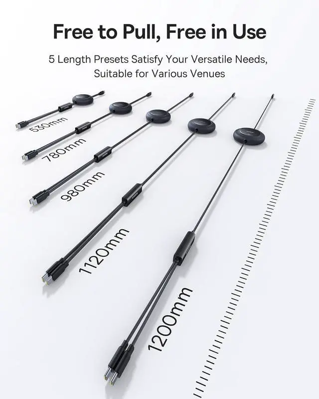 ^^ Adjustable Length: The retractable USB-C cable features 5 length presets for versatile needs. Whether you use it in the car, at your desktop, or on your nightstand, just pull the cable to your desired length to charge without causing cable messes. ^^ PD 100W