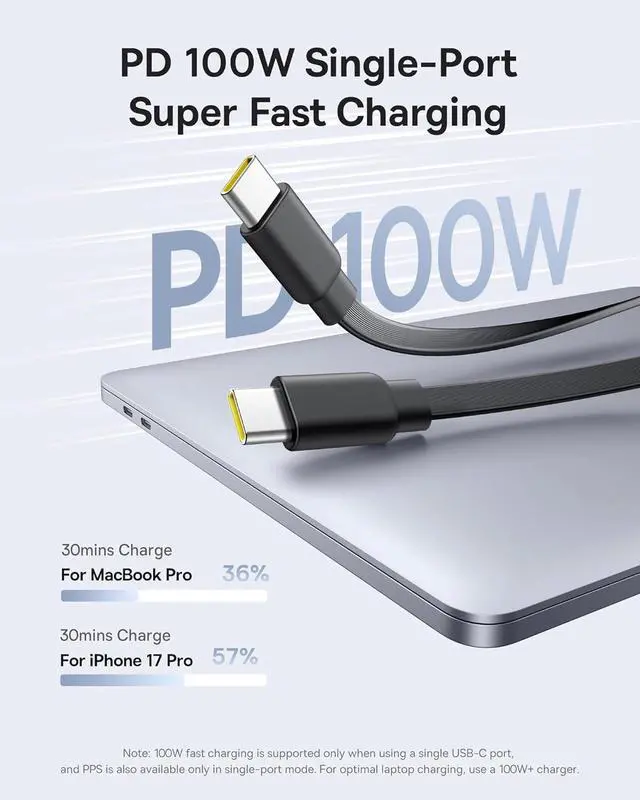Fast Charging: The maximum power output of one fast charging cord Type-C can reach 100W, letting you boost a MacBook Pro to 36% in a 30-minute charge. It is suggested that you use a 100W power adapter or higher for better laptop charging.