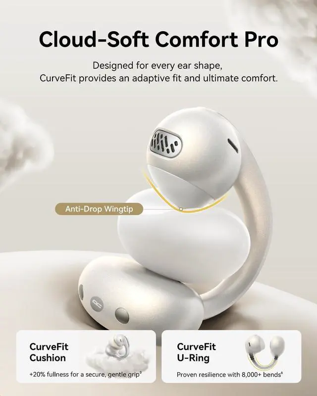 All-Day Clip-On Comfort: The open-ring clip earbuds feature ultra-soft, resilient CurveFit cushions, anti-drop wingtips, and a flexible TPU U-ring with memory titanium wire tested for 8, 000+ bends. At just 5g, these open-ear earbuds are designed to offer a breathable, adaptive, secure fit with cloud-like comfort for various ear shapes without irritation and pressure ^^