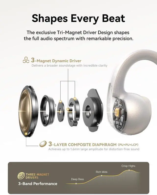 Immersive Studio-Quality Sound: The MC1 Pro open ear headphones feature a Tri-Magnet Dynamic Driver and 3-layer composite diaphragm, delivering a wide soundstage with low distortion. Thanks to the SuperBass 2.0 dynamic algorithm and professional-grade HiFi 4 acoustic architecture, you can feel every beat and experience CD-quality sound with rich audio detail ^^ Hi-Res