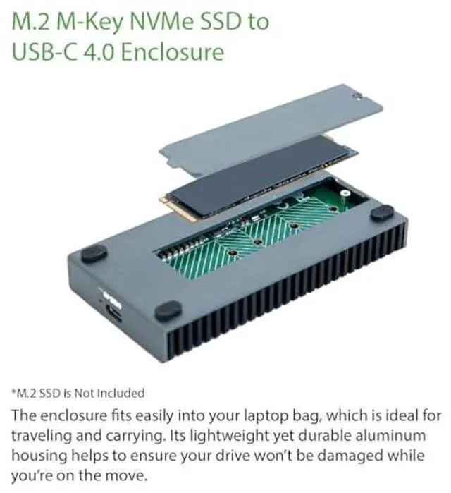 Aluminum Slim design, portable storage is truly a portable solution. It turns your M. 2 NVMe SSD Enclosure M Key into a high-speed storage solution via a USB 4.0 Gen 4x4 connection, at up to 40Gbps throughput. The M. 2 NVMe SSD enclosure fits easily into your laptop bag, which is ideal for traveling and carrying. Its lightweight yet durable aluminum housing helps to ensure your drive won't be damaged while you're on the move. Compatible with NVMe SSD size 2280, the enclosure works with tablets, laptops and desktop computers and other USB-enabled devices with its included USB C cables.