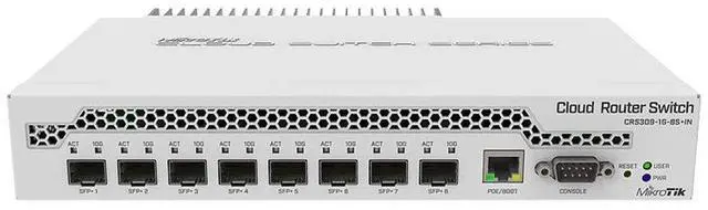 The CRS309-1G-8S+ is a very compact, yet powerful networking switch. It has eight SFP+ slots, supporting up to 10 Gbit module in each, which results in a total switching capacity of 162 Gbps and total non-blocking throughput of 81 Gbps. The device also has dual-core 800 MHz CPU, 512 MB RAM, a management Ethernet port with PoE power input, RS232 serial port, a grounding terminal and is capable of dual boot (choose which operating system you prefer, RouterOS, or SwOS).
