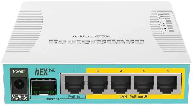 hEX PoE is a five port gigabit ethernet router for locations where wireless connectivity is not required. The device has a USB 2.0 port and a SFP port for adding optical fiber connectivity. The ports 2-5 can power other PoE capable devices with the same voltage as applied to the unit.