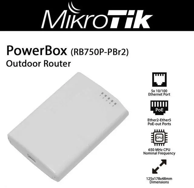 The PowerBox is an outdoor five Ethernet port router with PoE output on four ports. You can use this device to supply power to four PoE capable devices such as our SXT or others.