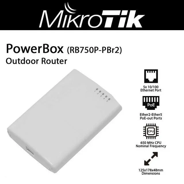 The PowerBox is an outdoor five Ethernet port router with PoE output on four ports. You can use this device to supply power to four PoE capable devices such as our SXT or others. Since the device has a waterproof outdoor case, you can mount it on a tower, or in other outdoor locations. The unit has five shielded Ethernet ports, four of which can power other PoE capable devices with the same voltage as applied to the unit (max current out is 1A per port, max total out is 2A). Less power adapters and cables to worry about!