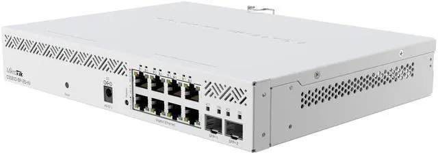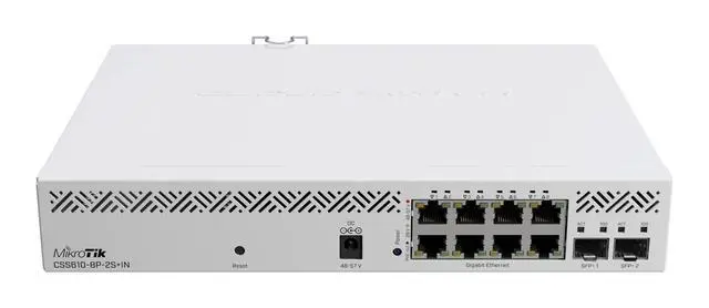 610-8P-2S+IN with 8 x Gigabit 802.3 af/at PoE-out ports, 2 x SFP+ cages, SwOS, desktop case, PSU