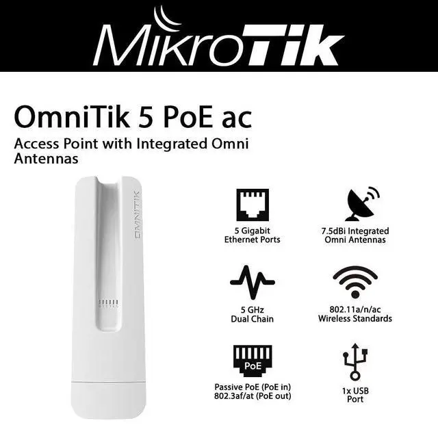 OmniTIK 5 PoE ac also known as RBOmniTikPG-5HacD features five Gigabit Ethernet ports and support for 802.11 ac. Its equipped with a powerful 720MHz CPU, 128MB RAM, high power 802.11 a/n/ac Dual Chain wireless (support for AC as well as backwards compatible with regular 802.11 a/n CPE) and comes with a new design weatherproof outdoor enclosure, two integrated 7.5 dBi 5GHz omni antennas, a power supply, a PoE injector and a mounting kit. It also supports passive or standard 802.3 at/af PoE input/output. Ethernet ports 2-5 can power other PoE capable devices with the same voltage as applied to the unit.
