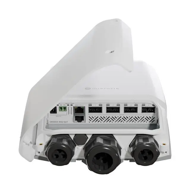 CRS504-4XQ-OUT: a versatile, cost-effective, ultra-fast weatherproof switch for all your outdoor needs. At the core of this masterpiece, we have an incredible Marvell Prestera switch chip. And there are four 100 Gigabit QSFP28 ports. Use them to connect other 100 Gigabit devices or grab a breakout cable to connect multiple 25 Gigabit devices. Heres where the speedy switch chip really shines: each port is connected to four 25 Gigabit lines. That means youre getting up to 16 high-speed fiber interfaces from a single outdoor switch! You can mix and match all kinds of connections this way: 100 Gigabits on one port, 40 Gigabits on the other, 4x25 Gigabits on the third, and maybe even some 10G or 1G cables on the fourth. And all this versatility comes in a sturdy, weatherproof IP66-rated enclosure. This rating proves its strong enough to handle powerful water jets from any direction! When it comes to outdoor event planning, you can never be too prepared. So having multiple powering options is a must! And CRS504-4XQ-OUT has got you covered: theres a standard DC jack, a 2-pin terminal, and 802.3 bt PoE-in. Weve also kept the good old management and console ports to help you deal with any unexpected situations. Performance-wise, CRS504-4XQ-OUT is a real workhorse that can handle VLANs, ACL, MLAG, Jumbo frames, and so much more even some L3 hardware offloading! The mighty Marvell Prestera switch chip dominates most tasks without blowing the power consumption up only up to 25W (without attachments). Stop waiting for the perfect weather invest in the perfect tools!