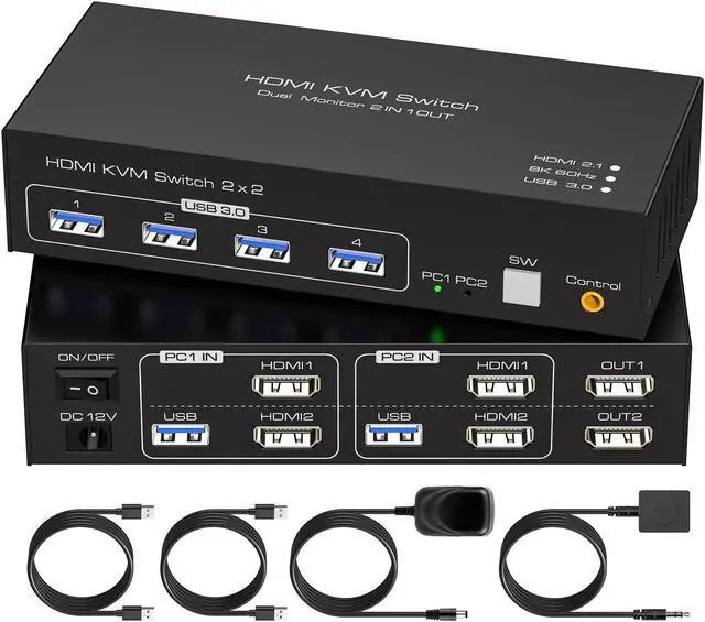 SPSWHD 8K@60Hz HDMI Dual Monitor kvm Switch 2 Monitors 2 Computers 4K@120Hz USB 3.0 Extended Display KVM switcher with 4 USB Ports Wired Controller 12V DC Adapter 2 USB Cables Included