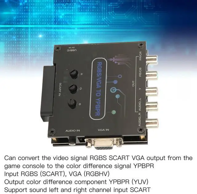 ENHANCED CONVERSION FEATURES: This VGA to YPBPR converter supports various input such as RGBS (SCART) and VGA (RGBHV), and outputs color difference component YPBPR (YUV). It also supports sound input with left and right channels via SCART ^^