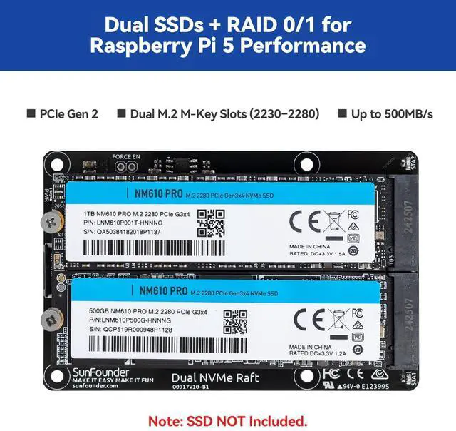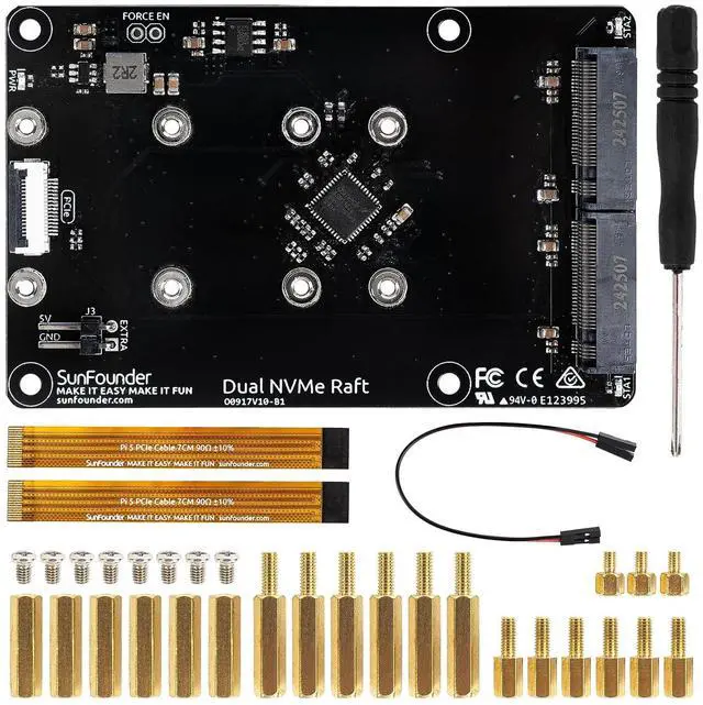 Great for AI projects like vision, and automationideal for developers, robotics makers, and edge AI learners ^^ The Dual NVMe Raft comes with everything you need: 2 PCIe FPC cables, SSD mounting screws, copper pillars, and a clear installation guide. With step-by-step instructions and online tutorials, setup is quick and beginner-friendly ^^ Get help when you need itSunFounder offers detailed tutorials, online documentation, and active community forums to guide you through every step. Whether you're a beginner or an advanced maker, our team is here to support your project success