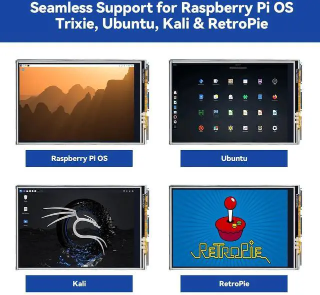 Equipped with a highly sensitive resistive touch screen and a matching stylus, this display ensures smooth and precise control. It requires no extra power supply, keeping your setup simple. Comes with a detailed manual, online tutorials, and software drivers, supporting the latest Raspberry Pi OS Trixie. Easy and quick to install, perfect for beginners and makers alike ^^ Wide OS Compatibility & Smooth Multimedia Experience. Supporting Raspberry Pi OS, Ubuntu, Kali Linux, and RetroPie, this IPS LCD delivers up to 50FPS performance, 65K vivid colors, and a wide 170 viewing angle for excellent video quality and fluid playback.