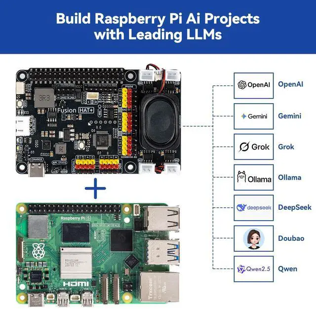 All-in-One AI Learning Lab Powered by Raspberry Pi & Multi-LLMs. Turn Raspberry Pi (5 / 4B / 3B+ / 3B / Zero 2W) into a complete AI learning lab with support for multi-LLMs like ChatGPT-4o, Gemini, Grok, DeepSeek, Qwen, Doubao, and Ollama. Includes Pan-Tilt HAT, rechargeable battery, 10-axis (10DOF) module, camera, and high-quality components. Learn AI through guided video lessons created with educator Paul McWhorter. (Raspberry Pi not included) ^^ Build Fun Multi-Modal AI Projects with Voice, Vision & Sensors. Combine sensors, breadboard circuits, Multi-LLMs, voice recognition, and camera vision to create engaging multi-modal AI projects.