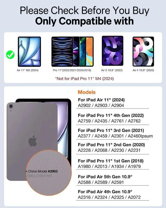 [(COMPATIBILITY)] Before making a purchase, please check the tablet model number. The ultra-thin keyboard case is designed for iPad Air 11 inch (M2) 2024 (A2902,A2903,A2904), for iPad Air 5th Generation 10.9 inch 2022 (A2588/A2589/A2591) / for iPad Air 4th Generation 10.9 inch 2020 (A2072/A2316/A2324/A2325) / for iPad Pro 11 inch 4th Generation 2022(A2759/A2435/A2761/A2762) / for iPad Pro 11 inch 3rd Generation 2018 (A2377/A2459/A2301/A2460) / for iPad Pro 11 inch 2nd Generation 2020