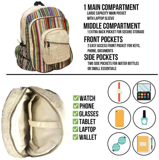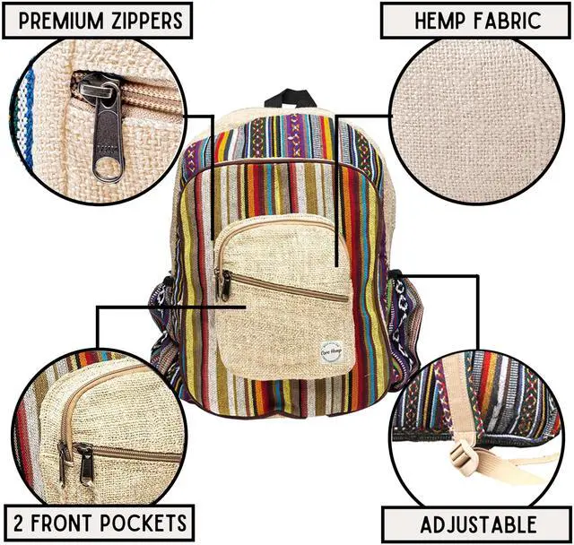 Large Boho Hippie Hemp Backpack - Lightweight Multi-Pocket Bookbag for College, Travel, and Hiking, Fits up to 15.6" Laptop, For Men and Women