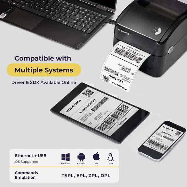 COMPATIBLE with A BROAD RANGE of PLATFORMS - The label printer seamlessly integrates with major e-commerce platforms such as , Etsy, and eBay, and popular shipping carriers like USPS and FedEx, simplifying the label creation process and enabling efficient printing of shipping labels. Its compatibility with Windows, Linux, and Mac operating systems, along with its ability to emulate Zebra ZPL, ensures that it is accessible and convenient for users of various workflows and platforms.