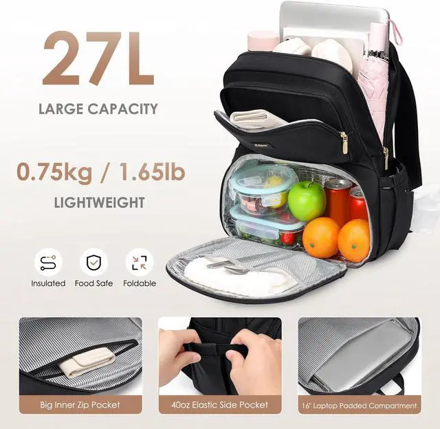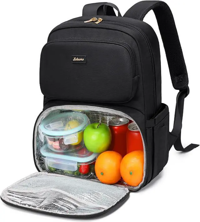 LABOMO Lunch Backpack for Women Work: Men 16 Inch Laptop Backpack with Insulated Leak Proof Lunch Compartment Large Picnic Lunchbox Bag Meal Prep Bookbag for Nurse Teacher Commuter Travel Black