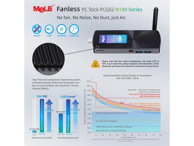 - Compact and Quiet Design: With an ultra-compact size (5.1x2.0x0.52 inches, 0.26 pounds) and fanless cooling technology,mele pcg02 stick pc operates for 24/7 use, with case temperatures reaching 55degC to 70degC . Its sleek design makes it perfect for clutter-free set