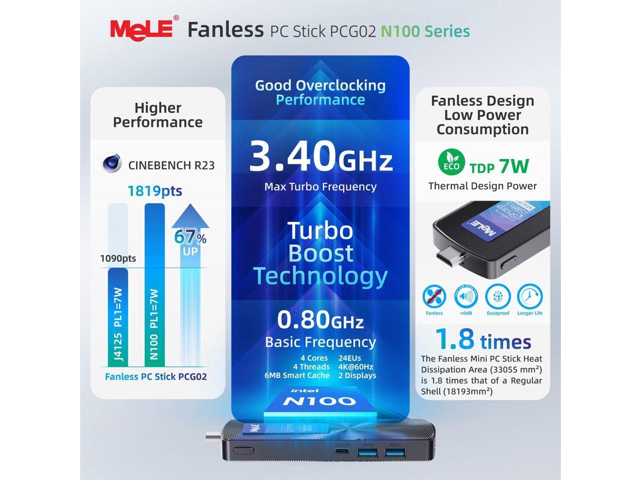 - Powerful Processor N100 for Smooth Computing: The pcg02 fanless mini pc stick is powered by 12th gen N100 processor with up to 3.4GHz burst frequency, 4 cores, 4 threads, and 6MB Smart Cache. This ensures a smooth computing experience for daily tasks, multimedia, and light office work, supporting multi-OS functionality.