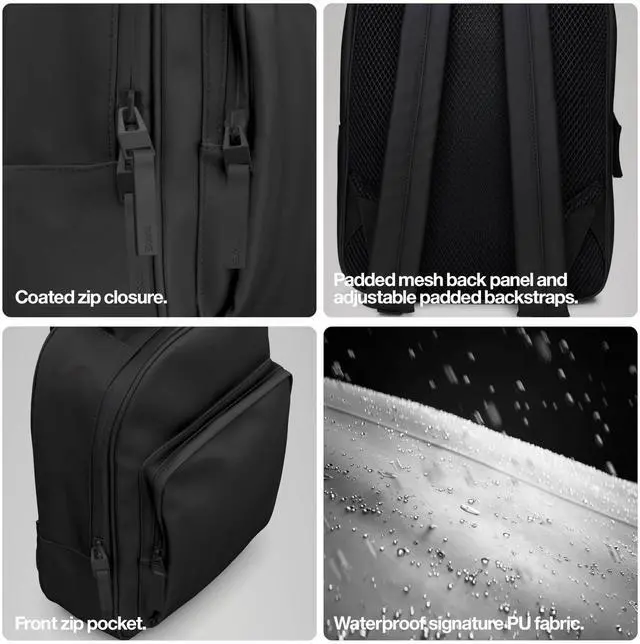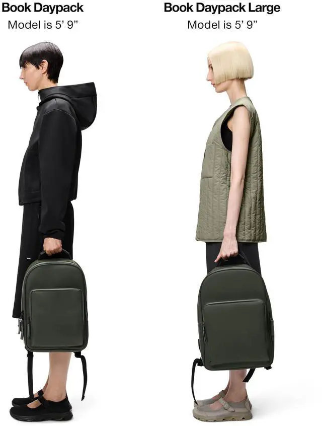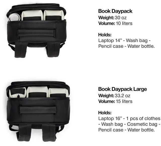 WATERPROOF: Book Daypack is a waterproof bag offering a minimal silhouette in campus-ready proportions. The design is characterized by its curved top, sharp base, and large front zip pocket. Opening the main coated zip reveals a spacious main compartment, which includes, a padded laptop sleeve for devices up to 14".