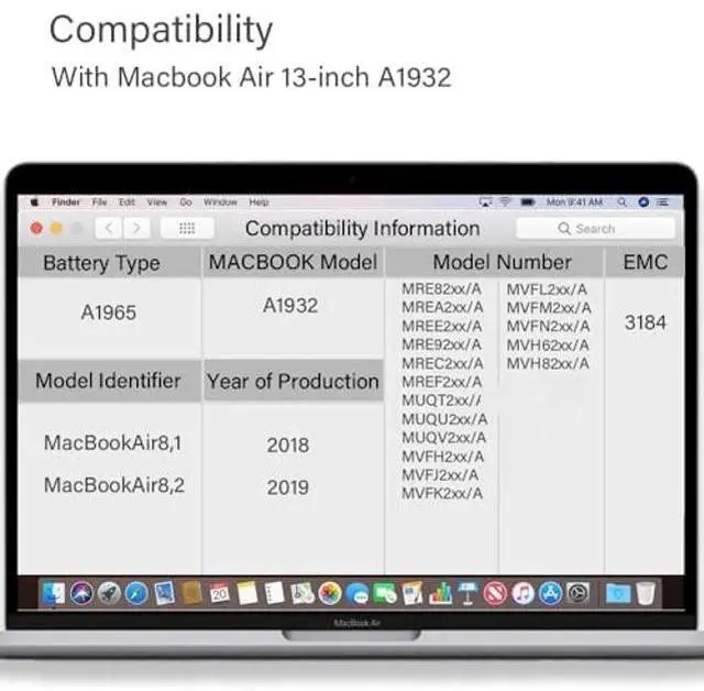 A1932 MACBOOK AIR BATTERY REPLACEMENT: A1965 BATTERY SPECS: Capacity: 4800 mAh,55 Wh, Voltage: 11.4 V, Battery Type: Li-Polymer. Package included:one OEM battery for macbook air A1932 Battery A1965, two screwdrivers and one installation instructions