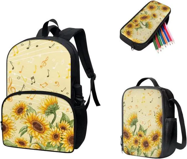 Viewamoon 3 Pack Sunflower Backpack Large for Preschool Toddler Girls 8-12 Age Large Lunch Bag With Elastic Water Bottle Pocket And Pencil Case,Muisc Note Pattern Sunflower Backpack Cute School Bag