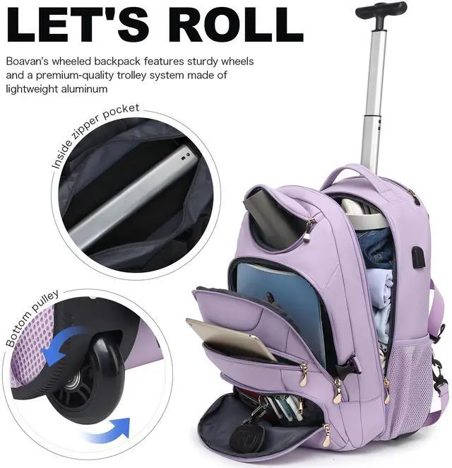 Boavan Rolling Backpack for Women, 17.3 Inch Wheeled Laptop Backpack, Large Travel CarryOn Bag for Teachers College Students, USB Charging Port Waterproof Business for Airplane Overnight Luggage, Purple