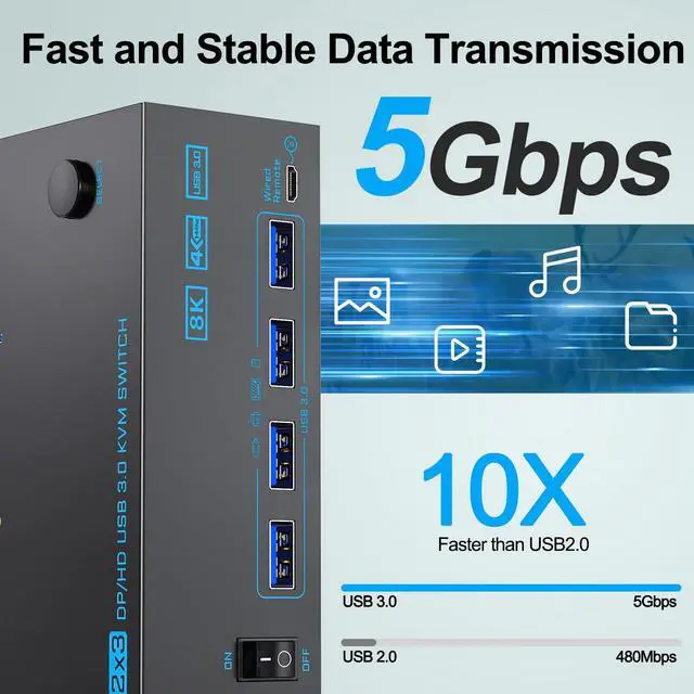 [(Ultra 8K Triple Monitor KVM Switch)] The 3 monitor kvm switch is compliant with DP 1.4 and HDMI 2.1 standard. Displayport part supports max resolution up to 8K@30Hz/4K@144Hz; HDMI part supports max 8K@60Hz/4K@120Hz, which allows you enjoy stunning visual experience and smooth gaming experience at the same time. Note: To reach the max resolution, please ensure the source, monitor, DP cables and HDMI cables all support the resolution
