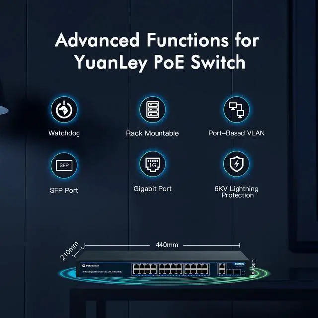 24 Port Gigabit Ethernet PoE Switch with 2 Uplink Gigabit Port & 2 SFP Port, YuanLey Unmanaged 24 Port PoE+ Network Switch, Rackmout, Build in 400W Power, Support 802.3af/at, Plug and Play