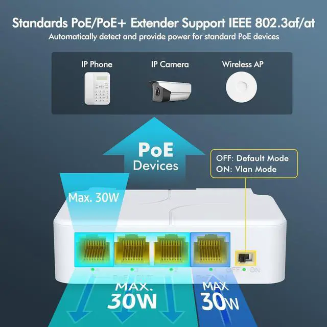 IEEE802.3af and IEEE802.3atThis 3 channel PoE extender works with all standard IEEE802.3af/at POE switches, POE injectors and POE NVRs. PoE voltage is 44-57V. The Max input is 30W, and the Max output is 30W. Each port can power standard PoE devices like IP phones, IP security, IP speakers, etc.
