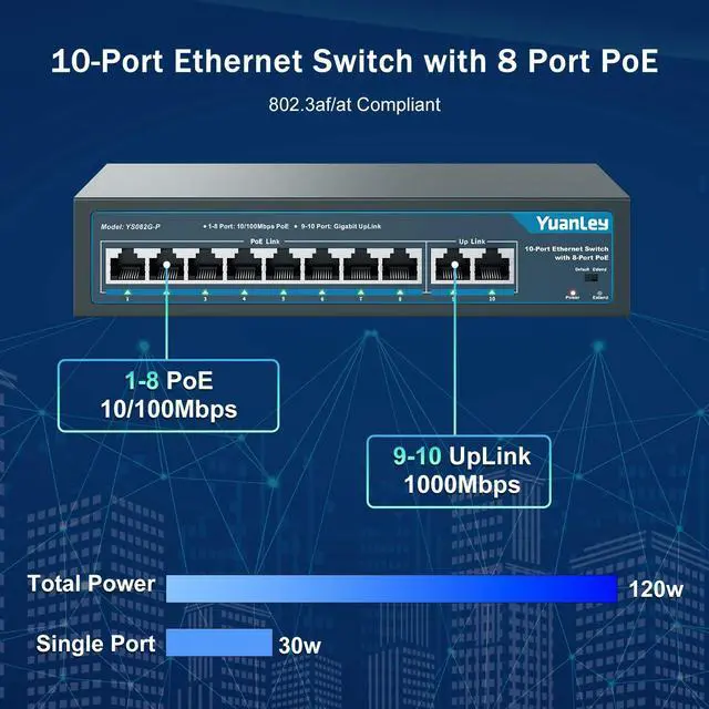YuanLey 8 Port PoE Switch with 2 Gigabit Uplink, 8 PoE+ Port 100Mbps, 120W 802.3af/at, Extend Function, Metal, Fanless, Unmanaged Plug and Play Network Switch