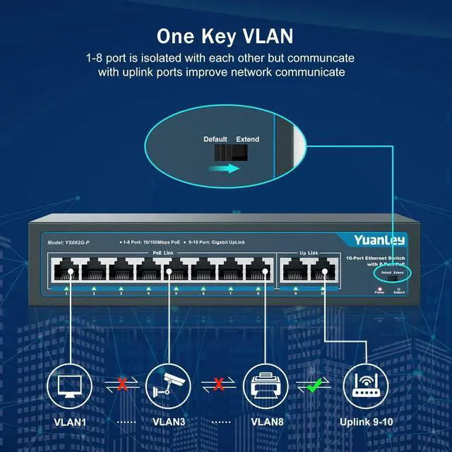 250m and VLAN support When the extend mode is enabled, single POE port supports 250m transmission distances and 10Mbps speed. 1-8 ports support VLAN isolation, reduce network congestion, improve the network safety.