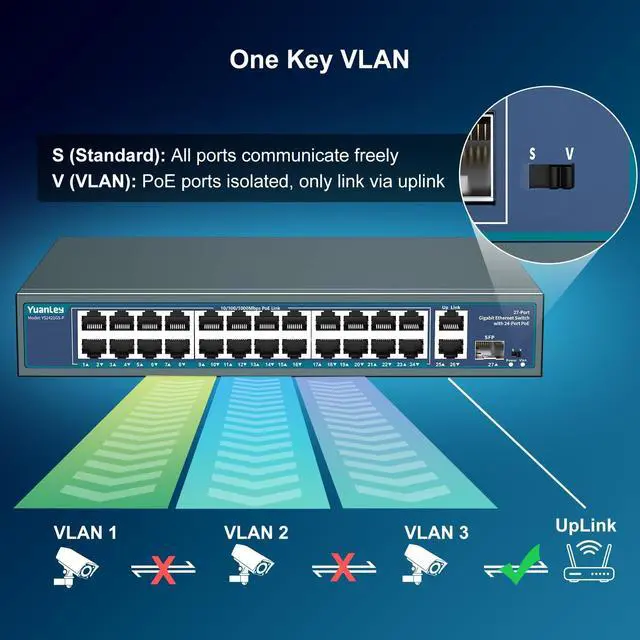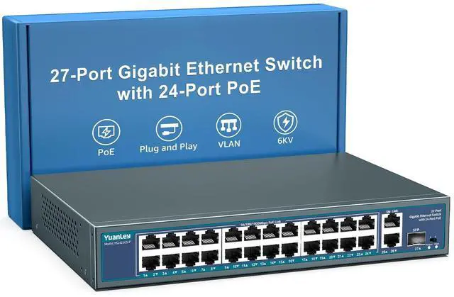 27 Port Gigabit PoE+ SwitchTotal Max 400W internal power budget, up to 30W per PoE port, add-on 2 gigabit uplink port, 1 SFP port. IEEE 802.3 af/at compliant, automatically detects and identifies PD devices. Support AI Watchdog intelligent detection. Automatically restart the disconnection devices to make operation and maintenance more easier. ^^ VLAN SwitchPoE ports will be isolated respectively but can communicate with uplink port, Better Network Bandwidth up to 56 Gbps with higher Security. Ideal for PoE IP Camera, EAP, Access Point, IP Phone and other PD devices.