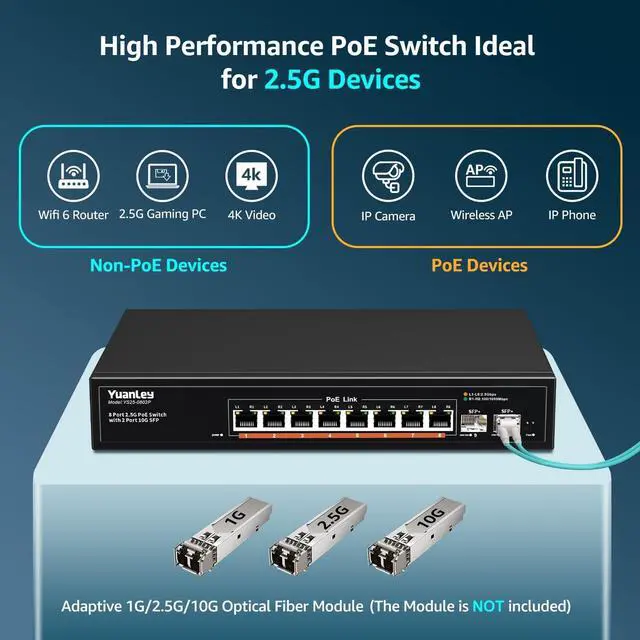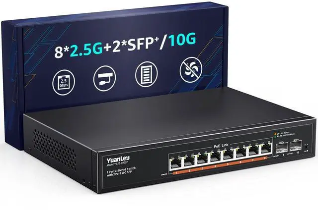 2.5G PoE SwitchThe network switch includes 8 x 2.5 Gigabit PoE ports, 2 x 10G SFP Port (Compatible 1G/ 2.5G Module, not include SFP Module). Ports 1-8 Compliant IEEE IEEE 802.3 bz ( 2.5G ) standard, support 10/100/1000M/ 2.5G adaptive, Auto MDI/MDIX. ^^ 120W Total PoE Power Support IEEE 802.3 af/at PoE power supply. The whole power is 120W, up to 30W per port. Suitable for poe power supply for multiple devices. 2.5 x faster than Gigabit Switch, provided 60Gbps switching capacity, higher and faster configurations. ^^ One-Key VLANThe 4-Port 2.5G network switch features one-key VLAN, isolates communication between rj45 ports, enhancing network security and reducing unnecessary traffic for improved performance.