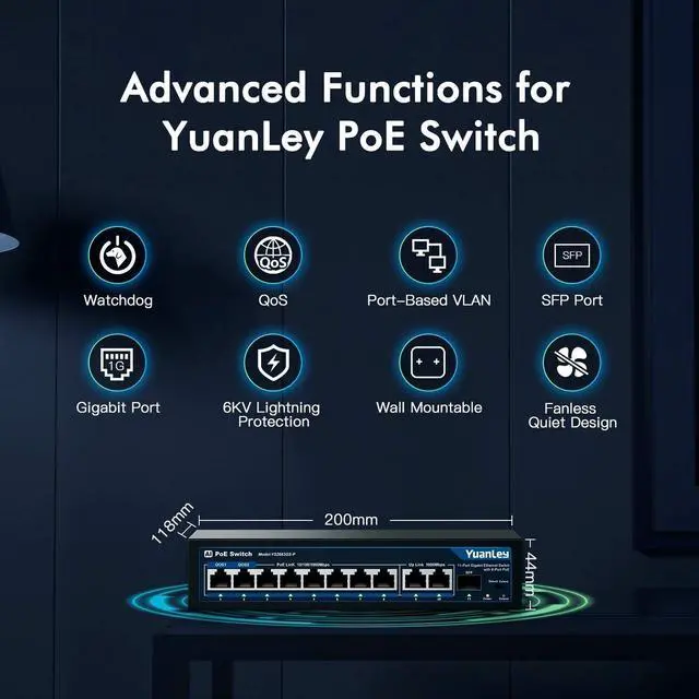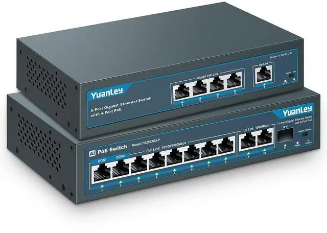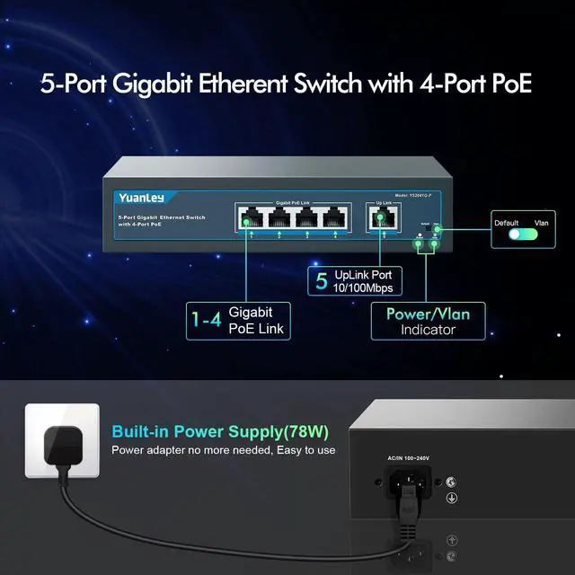All Gigabit Ports Includes 4 Gigabit PoE ports with 1 Gigabit UpLink Ethernet port switch and 8 Gigabit PoE ports switch with 2 Gigabit UpLink Ethernet port, 1 SFP port, all ports up to 100/1000Mbps speed, has excellent network performance. ^^ 78W/120W High PoE Power Support IEEE 802.3 af/at PoE power supply. The whole power of 5 port PoE switch is 78W, the whole power of 11 port PoE switch is 120W, up to 30W per port. Suitable for poe power supply for multiple devices. ^^ Extend Function When the extend mode is enabled, all PoE ports support VLAN isolation, the traffic are isolated from each other, improve the network safety.