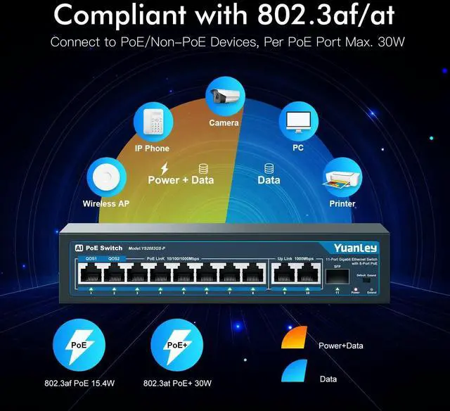 ^^ AI WatchDog, Qos11 port gigabit PoE switch Support watchdog AI intelligent detection. When the POE device fails or crashes and goes offline, it will automatically restart the device to restore the link, make operation and maintenance more easier. Ports 1 and 2 support QoS, when a lot of network data causes congestion, the data of these 2 ports will be forwarded first, to ensure that the data of important devices will not be lost. ^^ Unmanaged Switch All ports support PoE, and support automatic detection, can connect POE and non-POE devices, such as PoE Cameras, APs, computer, nvr, router and so on.