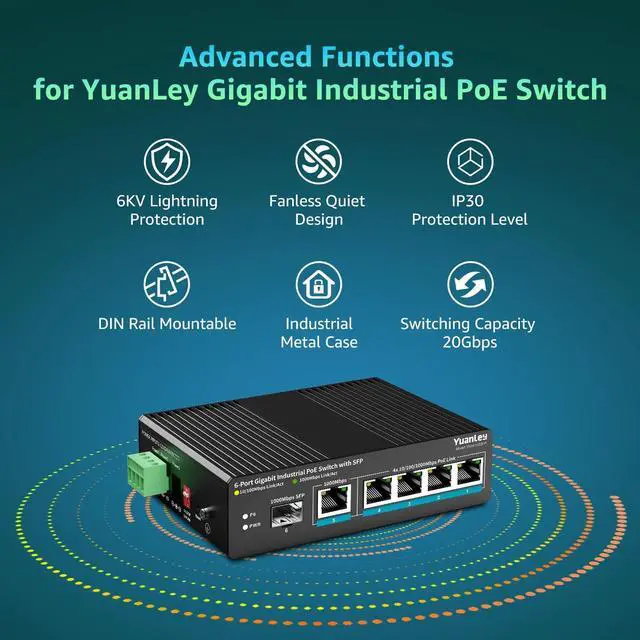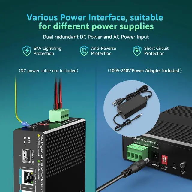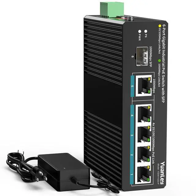 Full Gigabit PortsYuanLey 6 ports industrial poe switch includes 4 Gigabit PoE/PoE+ ports, 1 Gigabit Uplink and 1Gigabit SFP port; 1-4 ports support IEEE 802.3 af/at. Single port PoE power up to 30W, the maximum PoE output power is 120W, it can automatically detect and recognize the power receiving equipment that meets the standard and supply power through the network cable. ^^ Flexible Power OptionsThis industrial PoE switch supports dual redundant power inputs, featuring a 100-240V AC adapter (included 120W Power Adapter) and a DC power input (12V/24V/48V, cable not included).