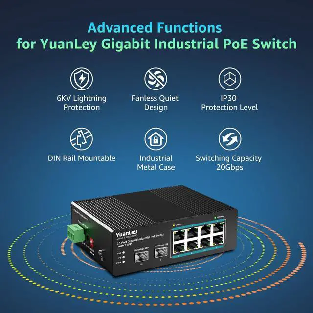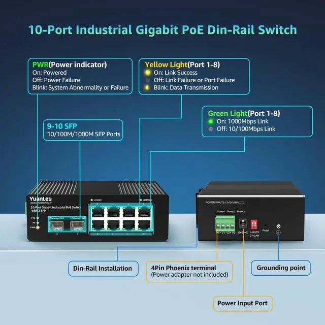 Full Gigabit PortsYuanLey 10 ports industrial poe switch includes 8 Gigabit PoE/PoE+ ports provide 48V power to PoE devices, 2 Gigabit Uplink and 2 Gigabit SFP port; 1-8 ports support IEEE 802.3 af/at. Single port PoE power up to 30W, the maximum PoE output power is 240W, it can automatically detect and recognize the power receiving equipment that meets the standard and supply power through the network cable. ^^ Flexible Power OptionsThis industrial PoE switch supports dual redundant power inputs, featuring a 100-240V AC adapter (included 120W Power Adapter) and a DC power input (12V/24V/48V, cable not included).